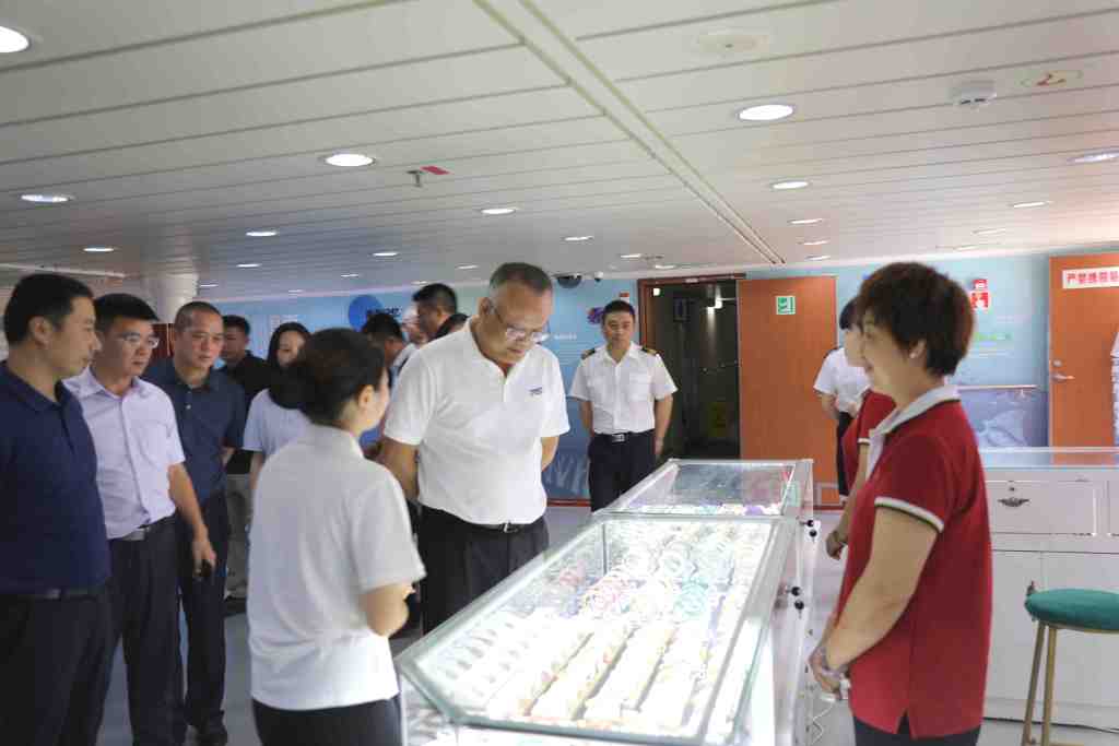 文斌参观“南海之梦”邮轮荣誉墙并听取汇报。陈明川摄