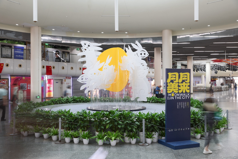 人民广场地铁站换乘大厅的《月奔》是所SHISUO与石勤玲携手完成。兔子剪影围绕着一轮明月如走马灯般旋转,地铁人潮与报站声为其伴奏,观者抬头望见玉兔飞奔的瞬间,仿佛在日常的都市脉搏里,重新发现了属于公共神话的温柔一隅。