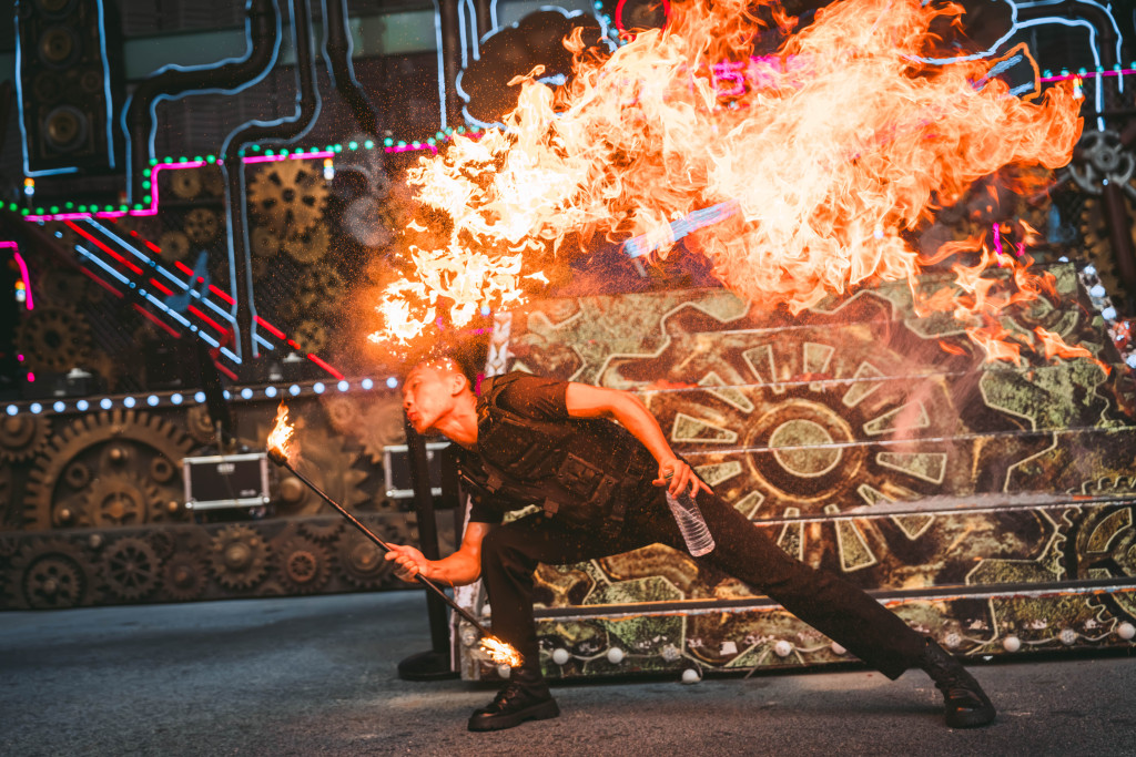 上海千古情景区推出“火人狂欢节”。火刀火棍火壶火流星等非遗火技精彩迭出,在这里,可以看到遁入神秘火光中的祭火拜月仪典,可以走进奇幻的朋克世界,蹦一场火焰迪斯科等。