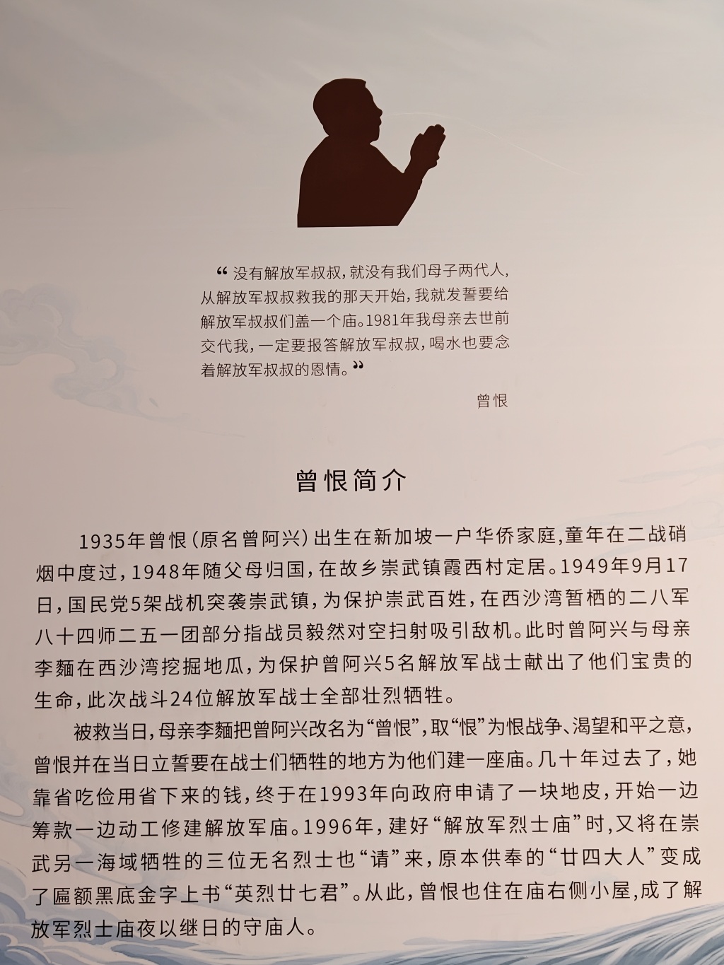 1949年9月17日,国民党5架战机发动了对当地的空袭,24名解放军战士为了保护当地的百姓,全部壮烈牺牲。当时有一个14岁的少女曾阿兴正跟她的母亲田里挖地瓜,有5名解放军战士为了保护她们母女而捐躯。女孩立志要在原址为牺牲的战士们建一座庙。1993年,58岁的曾恨终于在那里买下一块地开始建庙,她住在工地日夜监工。1996年解放军烈士庙竣工,此后,她就居住在庙边上的报恩堂里守庙。