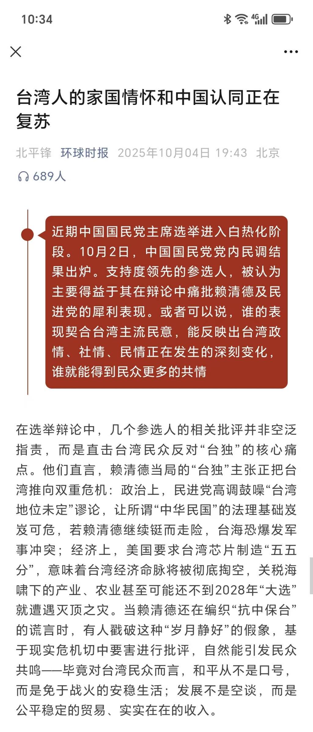10月4日晚,“北平锋”在《台湾人的家国情怀和中国认同正在复苏》一文中再度提及凌峰:如果说台湾网红“馆长”的直播是现实层面对“中国人”身份认同的再激活,9月28日年已80岁的凌峰先生在澳门“湾区升明月”晚会上演唱《吾爱吾国》,则是从文化与情感层面深化了这种认同。这首被尘封40余年的歌曲,歌词里“如果有轮回,我情愿投生,再回到中国”的滚烫情感,经凌峰老艺术家沙哑却真诚的嗓音唱出,瞬间击中了两岸同胞的中国心。歌曲结束后,他一句“中国人必然要有家国情怀,对不对”,没有激昂的口号,却像长辈谈心般穿透人心。有台湾网友边听边流泪,说这不是歌声,而是跨越海峡的思念,这是凌峰老先生对祖国的深情告白,也是每一名台湾同胞发自内心的真诚呐喊。