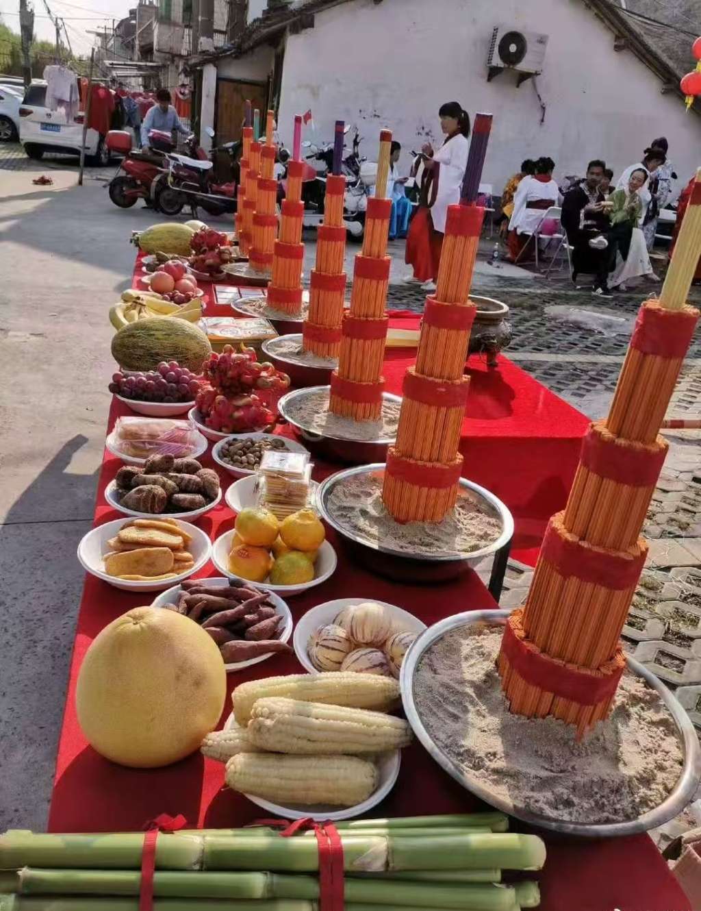 近年来三林民众自发恢复举办的中秋祭月仪式,延续了历史上“临塘设坛”的祭仪传统,通常将中秋祭月民俗仪式活动的核心区域设置于三林塘港沿岸,围绕“祭月、拜月、赏月”等主题开展系列活动。据三林镇民俗专家曹琪能先生介绍,农历八月十五的中秋祭月仪式,是三林老街民俗仪式中最具诗意的活动,其起源可追溯至古代的“秋祀”传统,是汉民族祭月习俗的地方化呈现,展现了三林地方民俗文化的“庄谐并济”特质。每年的中秋祭月仪式,设坛、备供等祭前准备活动从八月十四日就开始了,祭坛方位为坐西朝东(象征面朝月亮升起的方向),以八仙桌为基,铺以红布,摆放斗香、月饼、瓜果、塌饼等祭品,表达对月神的尊崇。正式祭祀仪式在八月十五月亮升起后举行,依次按照“迎月”“献供”“诵读祭文”“上香”“ 焚斗香”等环节展开。其中,“焚斗香”是祭月仪式的核心部分,以多层香料堆叠成斗形,外层糊彩纸,并绘有月宫、嫦娥等图案,点燃后香气弥漫。