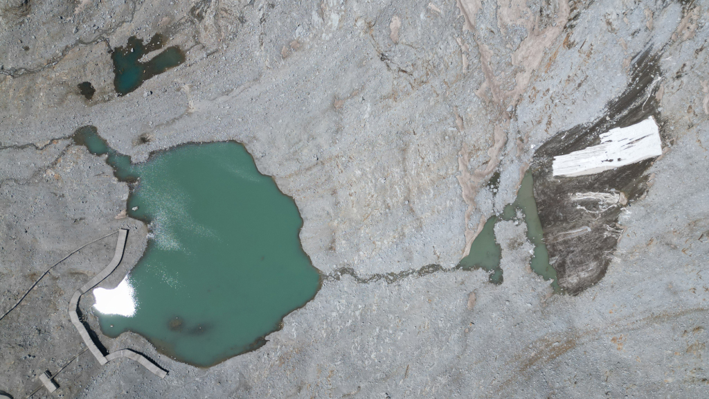 高温之下,达古冰川正以惊人的速度消融,融水在下游形成一个个湖泊,像碧绿的宝石镶嵌在高原上。DGL17(达古17号)冰川下,是达古冰川区域内最大的冰川湖泊,最近十年来,冰川退缩,湖面扩大,它被命名为泪湖。