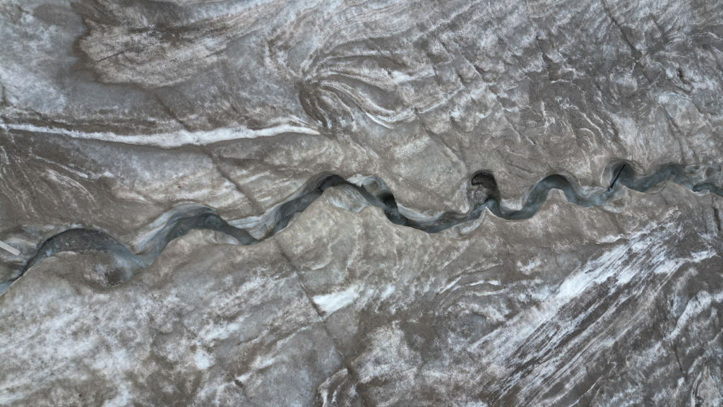 冰川融水在冰面上冲刷出一条蜿蜒的冰河