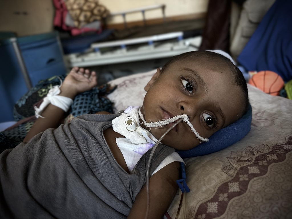 当地时间2025年9月21日,加沙纳赛尔医院,一名4岁的巴勒斯坦儿童在以色列的袭击中受伤。由于医疗物资短缺,加沙无法进行手术,他的气管被切开。视觉中国 图