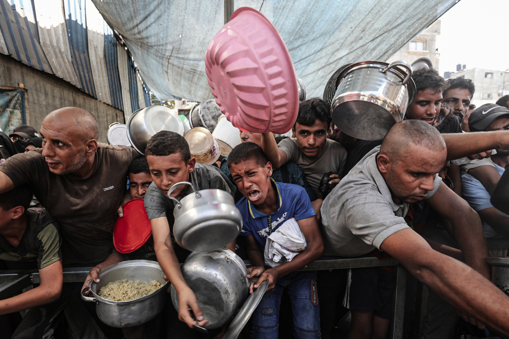 当地时间2025年9月28日,加沙地带中部努赛赖特难民营,由于以色列的封锁和持续袭击,食物短缺严重,人们等待获取慈善组织供应的热餐。视觉中国 图