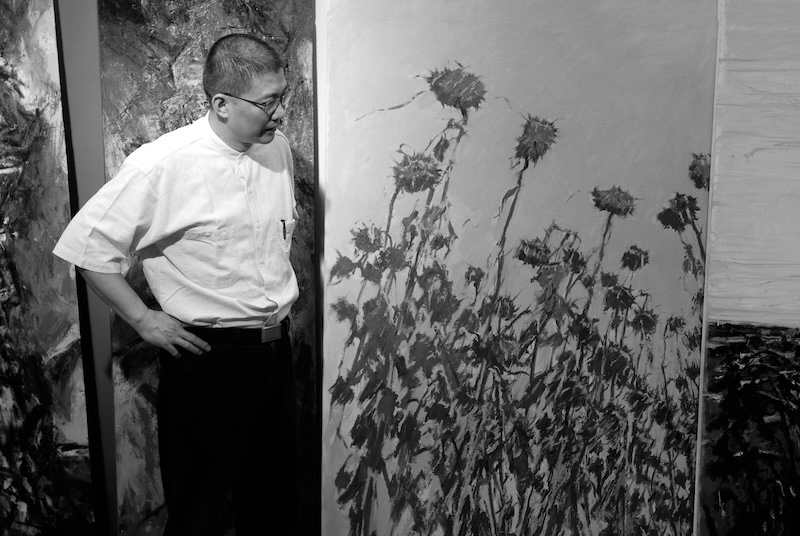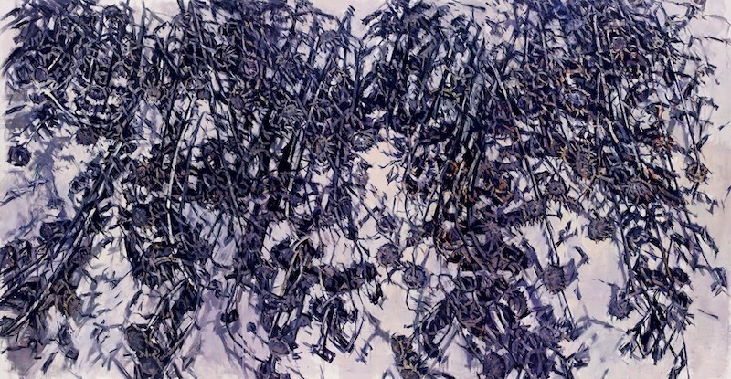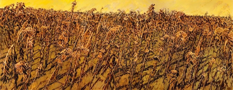“葵”是许江创作的另一大主题。他在序言中写道:“深入葵原深处,感受葵园呼吸,放牧葵园四季,倾听来自时代深处的呼唤。我的葵原创作采撷葵原大地的苍茫气象,铸炼富于东方精神的诗意风景;又将群葵编织在层层叠叠的山壑之上,敲击出壮阔灿熳的史诗鸣响。”