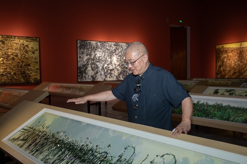 展览中,《葵原长卷》以浓重油彩堆叠出葵原的苍茫,葵杆如林、葵盘如炬。展厅里还呈现了许江与团队制作了上千个葵头与莲蓬头。