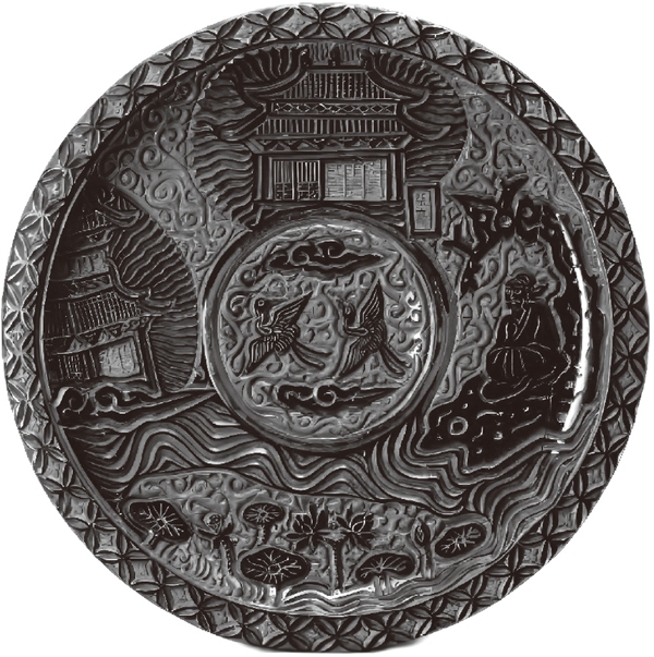 南宋时期,“张骞乘槎”形象开始变得细腻且愈加生动。江西九江瑞昌市博物馆藏有一面1986年杨林湖基建工地出土的南宋“仙人乘槎”纹饰铜镜(图4),镜纹内区为一人物乘坐树槎在波涛起伏的大海中行驶纹饰,外区为象征黄道十二宫的十二座亭形小宫环绕,内有人物、动物等纹饰。2004年日本根津美术馆曾举办一场名为“宋元之美——以传来漆器为中心”的展览,展出了一件直径19.8厘米,由黑、赤、黄三色漆错施漆层后剔出不同颜色图像的南宋堆黑张骞铭漆盘(图5),盘中心的右侧正是一幅“仙人乘槎”的图案,仙人形象生动传神。