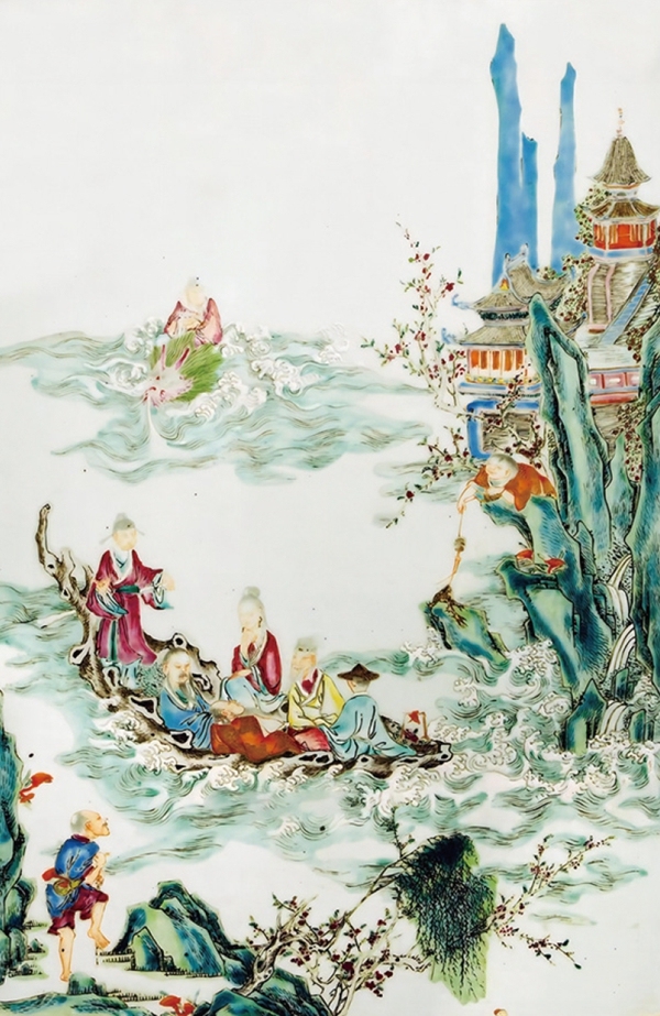 不仅如此,这一时期“仙人乘槎”形象还与中国传统文化中的仙人祝寿题材相融合,借此传达“寿诞绵绵,长生不老”的美好愿望。如故宫博物院收藏的清中期 “麻姑献寿仙槎”竹根雕,苏州博物馆收藏的清道光年间“粉彩诸仙乘槎祝寿纹”碗,四川宜宾市博物院也收藏有一件清代粉彩开光人物瓷缸,缸上也绘有八仙乘槎贺寿的画面。2017年西泠印社的秋季拍卖会上曾拍卖一件长41厘米、宽27厘米的清中期粉彩八仙贺寿图瓷板,图案中间为五位仙人乘槎漂浮于仙海中的画面。(图13—图16)虽然这一时期祝寿题材的乘槎形象已经和朱碧山银槎杯所表现的超然物外的浪漫主义含义不同,但是二者显然都深受“仙人乘槎”题材影响。