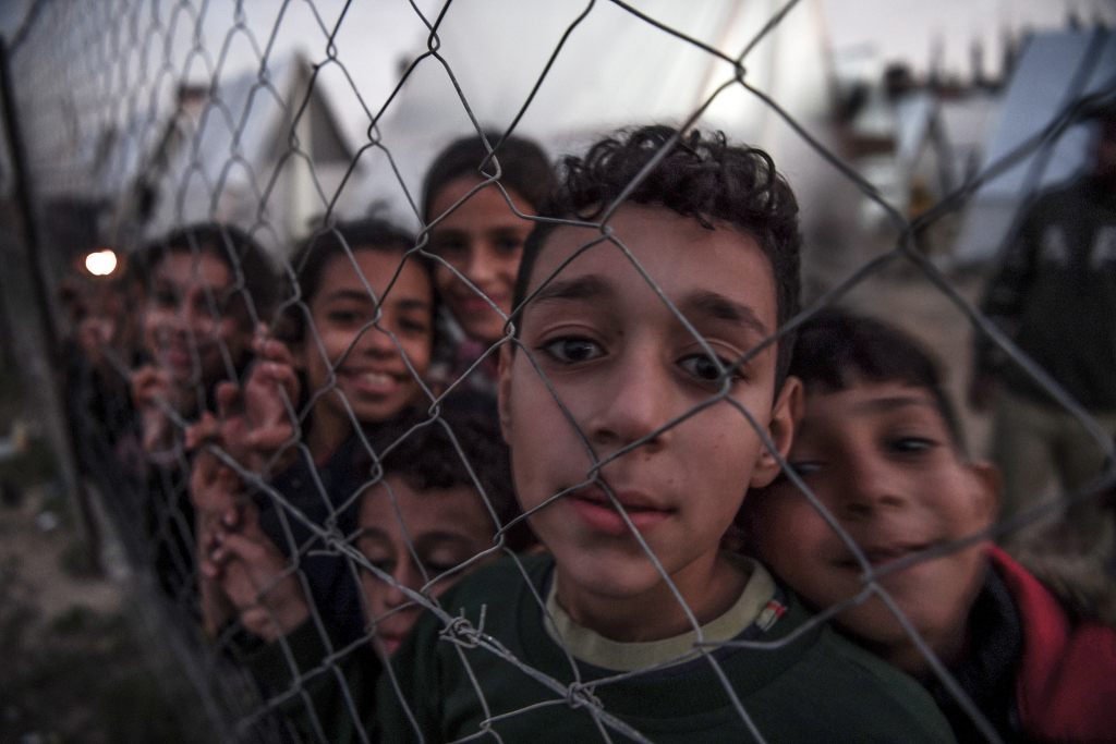 当地时间2023年12月21日,加沙地带拉法省,巴勒斯坦儿童离开家园,在拉法城避难。视觉中国 图