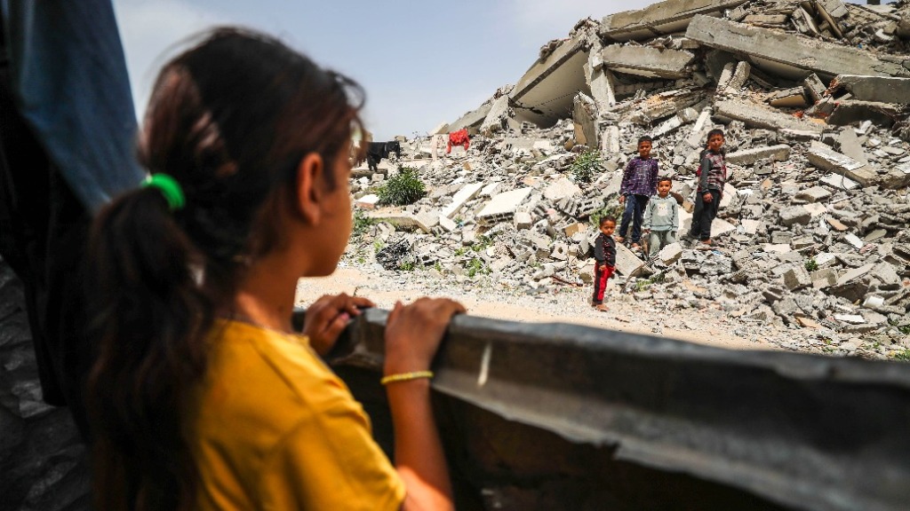 当地时间2025年4月7日,在加沙地带北部加沙,流离失所的儿童看着废墟。新华社 图